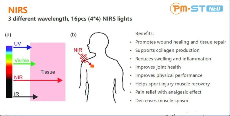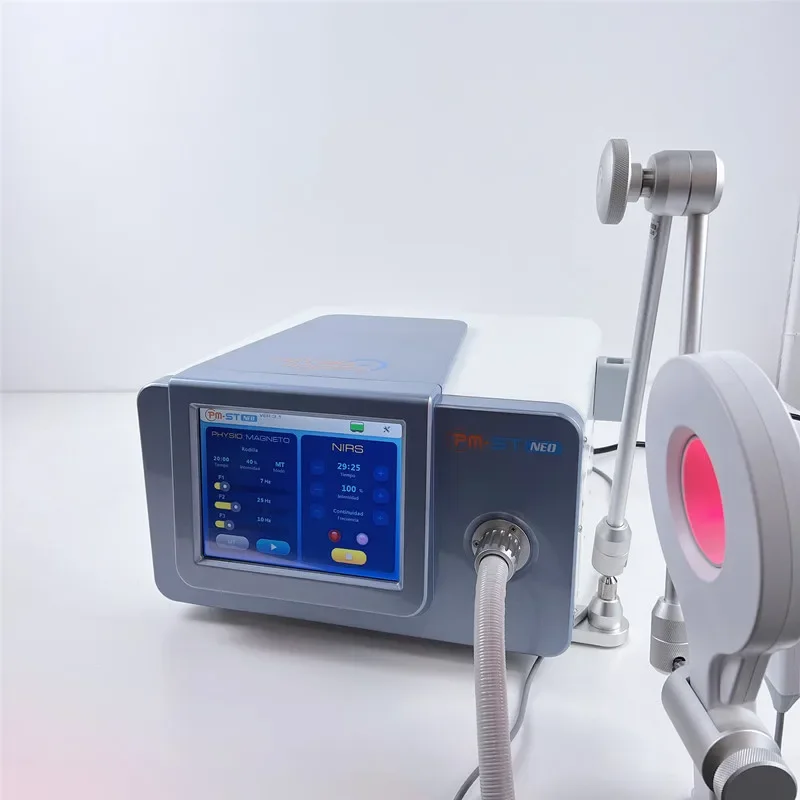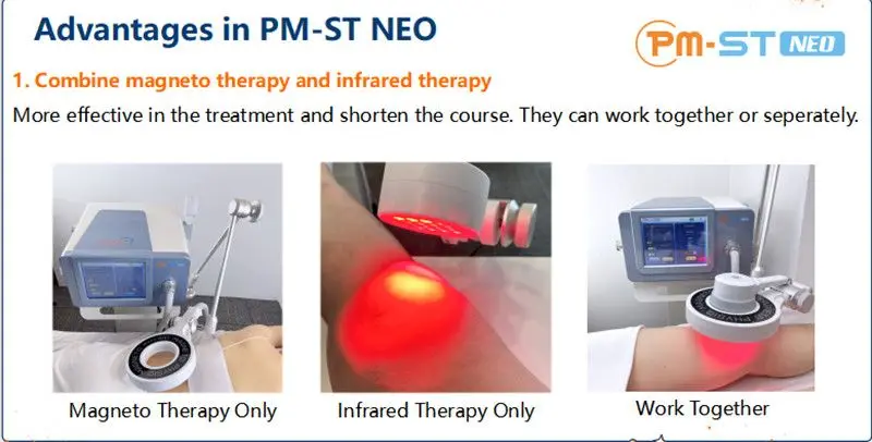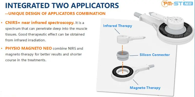 The PMST NEO features unique applicator design. The ring type electromagnetic coil applicator connect with NIRS applicator by the special design connector. It is the only one of it`s kind in world physiotherapy field , can transduce magnetic pulse deep into body tissue ,at the same time, near infrared light focused on the same treatment area. The two technologies perfectly combine together for better therapeutic effects.